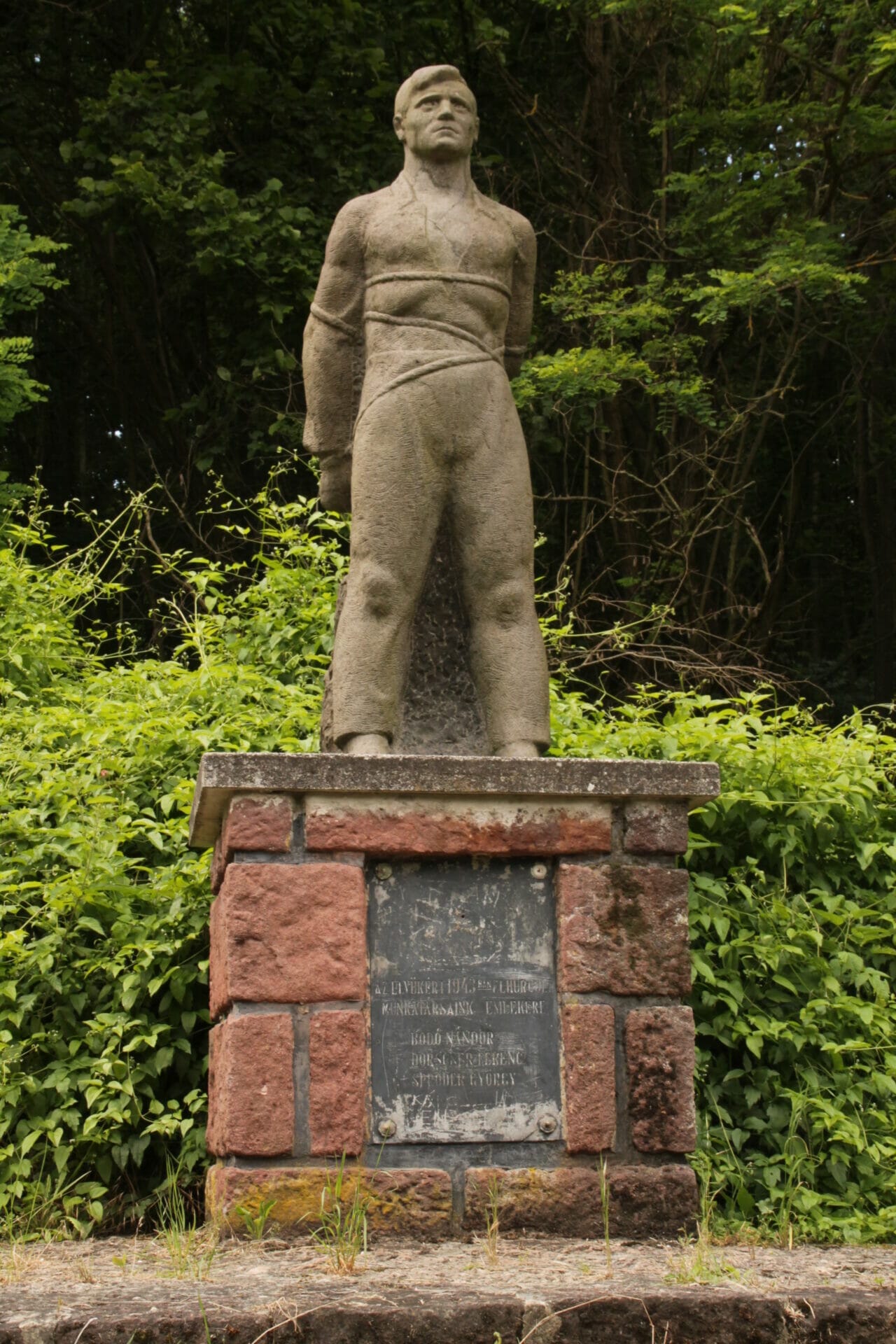 A permi vörös homokkőből álló talapzaton egy megkötözött férfit ábrázoló titokzatos, bazaltból készült szobor áll. Rajta felirat: „Az elvükért 1943-ban elhurcolt munkatársaink emlékére. Bodó Nándor, Dorscner Ferenc, Sprőder György.” Az id. Szabó István 1959-ben elkészített alkotásáról egy internetes forrás a következőket írja: „A történet szerint 1943. december 31-én Sprőder György kisgyóni vájár a Magyarországi Bánya és Kohómunkások Szövetségétől kapott tájékoztató közleményt olvasta fel a bányásztársaknak. Ezután Bodó Nándorral együtt elénekelték az Internacionálét. 1944. január 21-én mindkét bányászt csendőri felügyelet alá helyezték. Sprőder Györgyöt a budapesti Mosonyi utcai toloncházba internálták, így az 1944. április 1-jére kitűzött tárgyaláson nem vehetett részt.