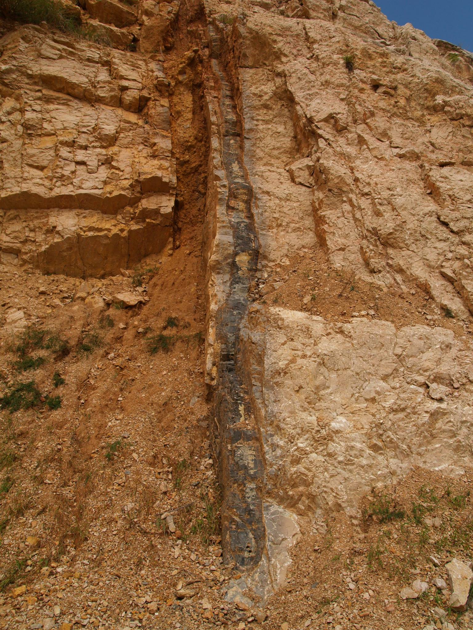 A fotón szintén jól látható, hogy a kőzetben nem csak kréta bazalt van, hanem megfigyelhető egy sárgásbarnás agyagos kitöltés is, amely miocén korú.