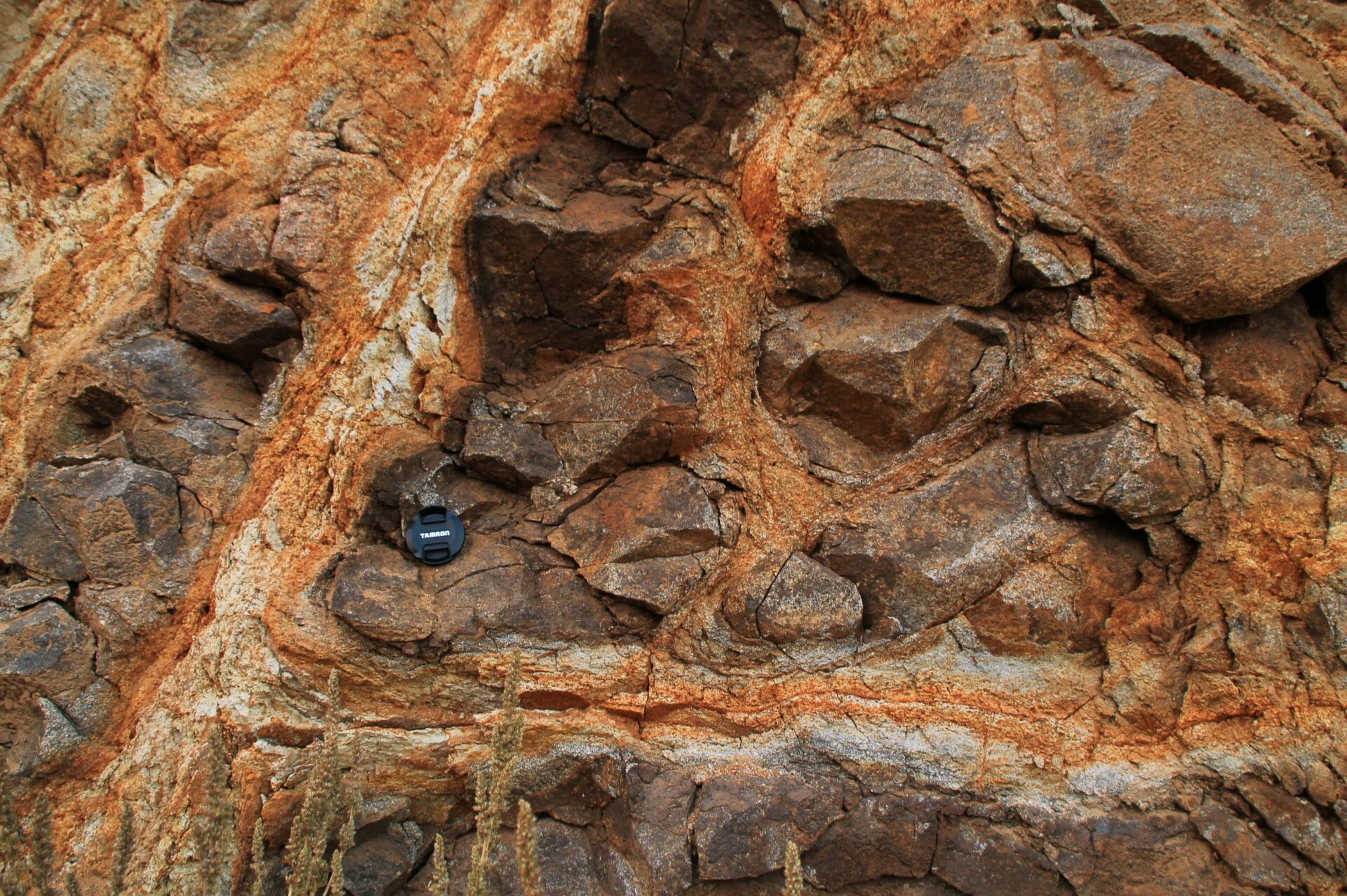 Az üde andezit repedéseiben beszivárgó, oxigént is tartalmazó csapadékvíz a kőzet ásványos összetételében átalakulási folyamatokat indított el. Az adott geokémiai rendszerben instabillá váló földpátok agyagásványokká (pl. kaolinittá) alakultak át, amely folyamat azonban a kőzet szerkezetében is jelentős változásokat eredményezett. Az átalakulás hatására a repedések mentén a kőzet elmállott, morzsalékos lett, utat engedve az eróziós folyamatoknak és a könnyebb lepusztulásnak. A csatolt képen is láthatjuk, hogy a repedések által határolt, gömbszerű üde andezit blokkokat a mállási folyamatok csak a külső felületük mentén érintették, legömbölyített bucikat alakítva ki a feltárásban. A másik szembetűnő geokémiai folyamat a limonitosodás, amelyet a vöröses elszíneződés mutat a repedések mentén és a bucik felületén. Az andezit eredeti, kőzetalkotó ásványainak (pl. piroxének, amfibolok) vastartalma az oxigéndús csapadékvizek hatására oldatba ment, majd a neki megfelelő helyen kicsapódott, vöröses elszíneződéseket alakítván ki. A folyamat során a két vegyértékű ferrovas három vegyértékű ferrivassá oxidálódott, vegyértékváltás kíséretében, kicsapva az addig oldott vasat szilárd formában. A limonit ásványok (pl. goethit: FeOOH) mintázata, rajzolata kiválóan mutatja az egykori oldatmozgások helyét és dinamikáját. A limonitos kiválások nem csak a repedések mentén alkotnak hosszú, vonalszerű rajzolatokat, hanem „bőrszerű” bevonatokat képeznek az üde andezitbucik felszínén is. A repedésekben található mállott kitöltésben a vasas oldatok mozgását a málladék porozitása és permeabilitása jelentősen befolyásolta.