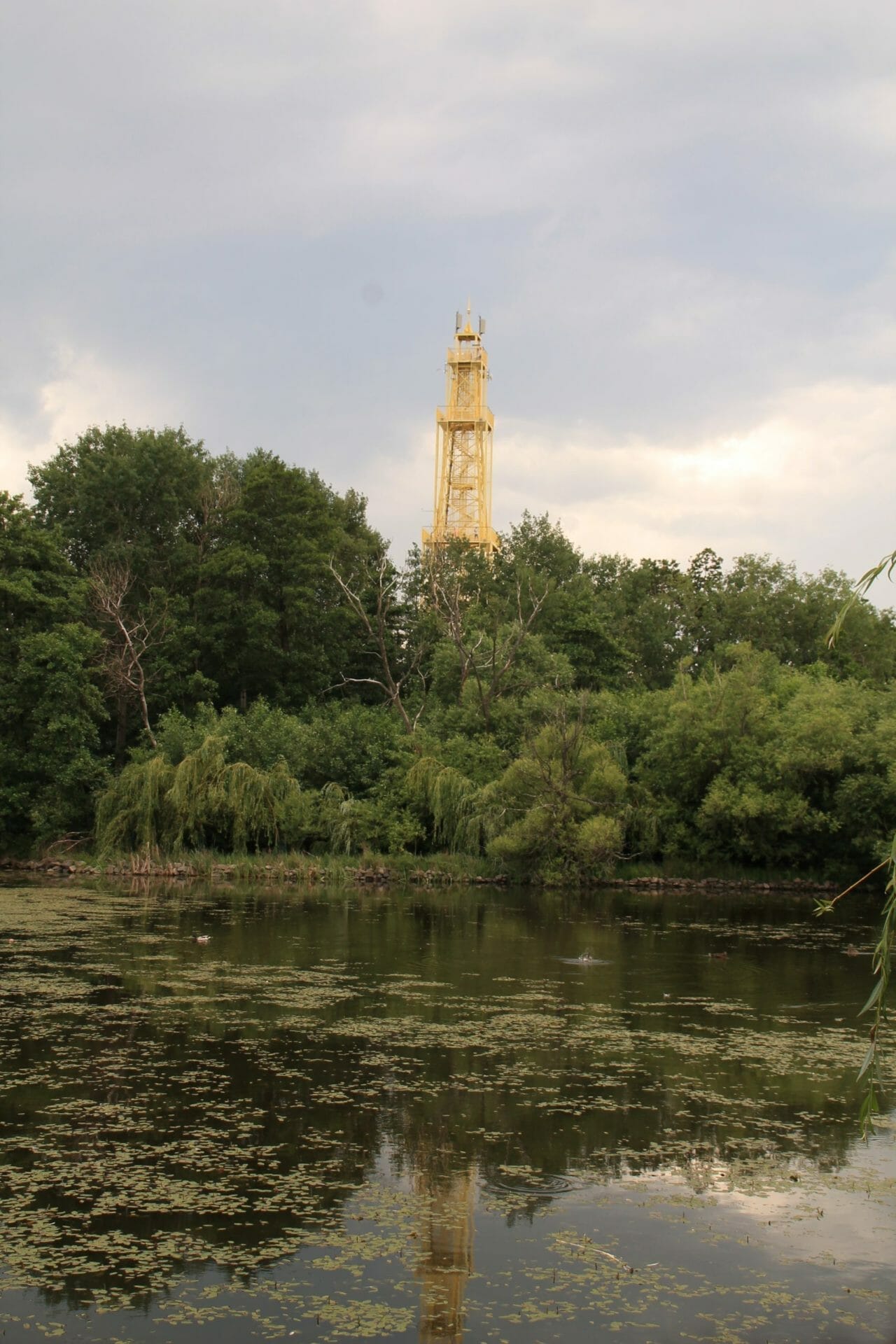 A Sás-tó víztükre, háttérben a fúrótoronyból lett kilátó