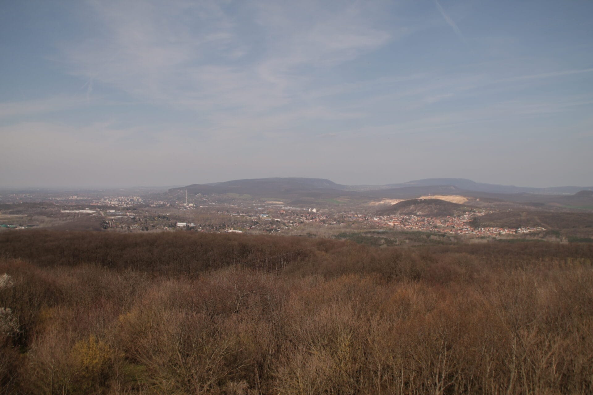 Észak felé tekintve a Gerecse rögvidéke, annak tektonikusan kibillent sasbércei (például Öreg-Kovács, Nagy-Gerecse, Pes-kő) és kisebb-nagyobb medencéi (például Héreg-Tarjáni-medence) láthatók. A medencében ülő Tatabánya felett a Kő-hegy meredek letörése is látszik, amely a Turulmadarat és a Szelim-lyukat hordozza, a Felsőgalla feletti Kálvária-hegy mögött pedig a Nagy-Keselő-hegy bányája éktelenkedik. Messze mögötte a tardosi Bánya-hegy „vörös márványt” termelő külfejtése is kivehető. A kilátóból kelet és délkelet felé szemlélve a tájat szépen látszanak a Szárliget környéki sasbércek (például Zuppa-tető), amelyeket normál vetők menti elmozdulások emeltek a magasba. A Vértes felé visszatekintve viszont a domborzat nem olyan élénk, mint a gerecsei tájban, hanem inkább „egyhangú”, erdőkkel fedett fennsík képét mutatja. Ebből a tájból alig emelkedik ki Körtvélyespuszta felett a nemrégiben meghódított Nagy-Csákány, valamint a Körtvélyesen álló geodéziai mérőtorony. A platószerű vértesi tájkép nem véletlen, hiszen a Vértes fennsíkja a kora és középső miocén meleg-csapadékos trópusi éghajlatának következtében letarolt felszín dél felé enyhén kibillent, kiemelkedett és továbbfejlődött (poligenetikus) maradványa. Itt jegyezzük meg, hogy a kilátó térségében már a triászra települő fiatalabb üledékes kőzetek (például a középső eocén Szőci Mészkő Formáció) is előfordulnak.